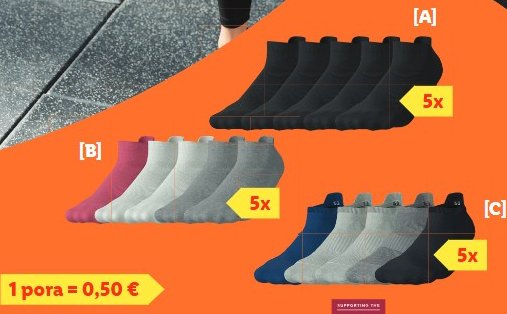 2,49€ už 5 poras; 1 pora = 0,50€; A: 35/36-45/46; B: 35/36-39/40; C: 41/42-45/46
